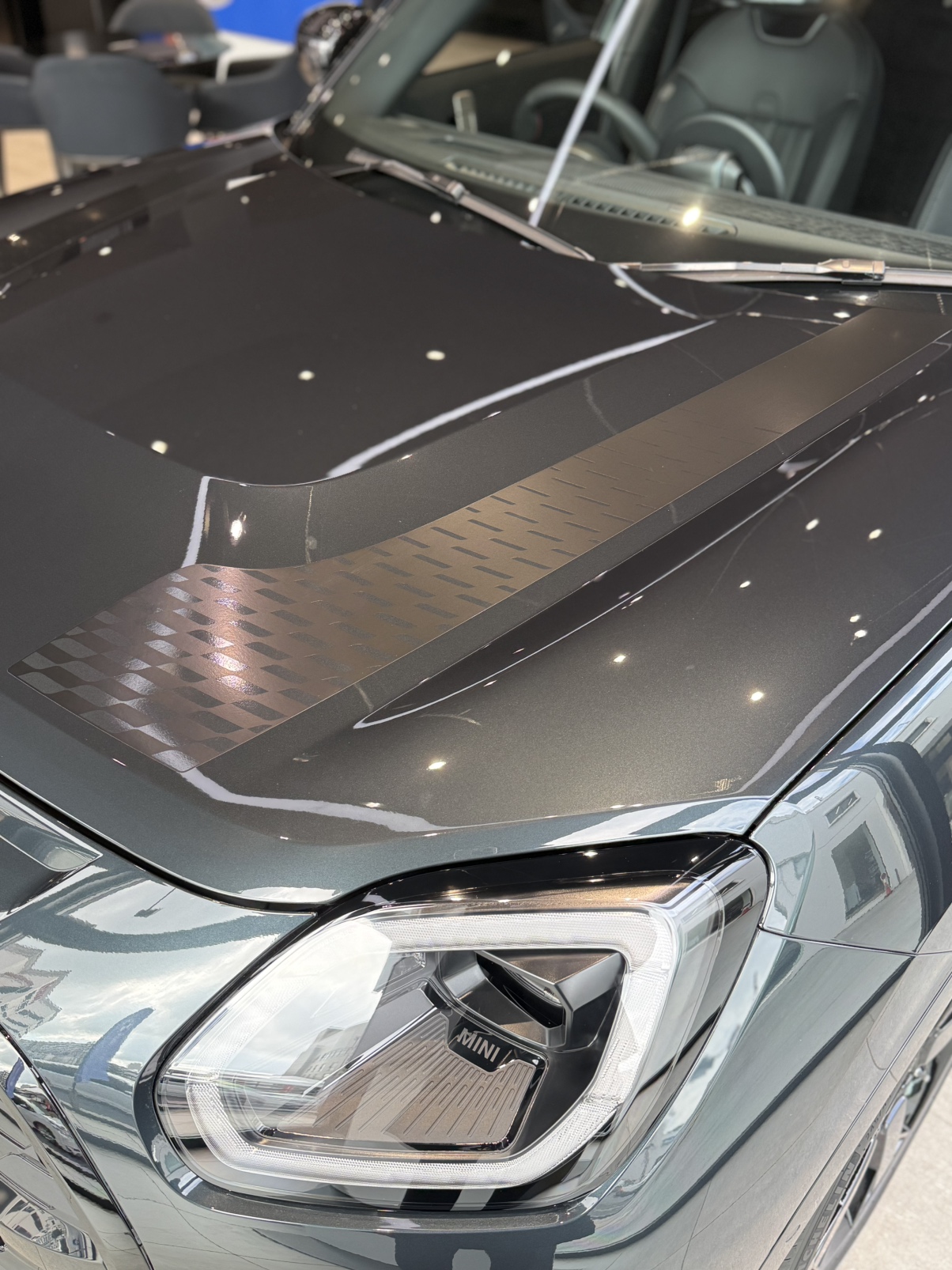 JCWらしいスポーティーさを感じられるボンネットストライプ。